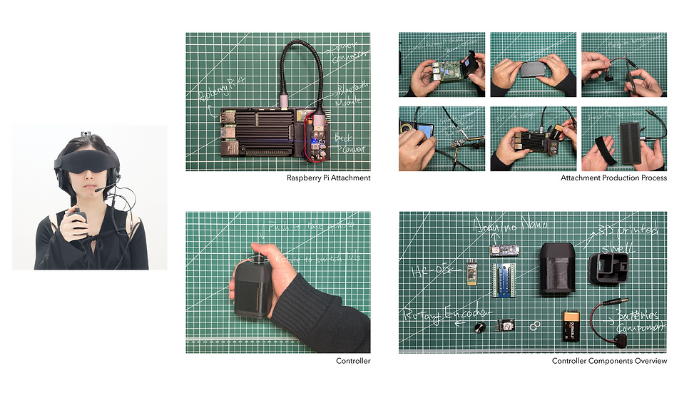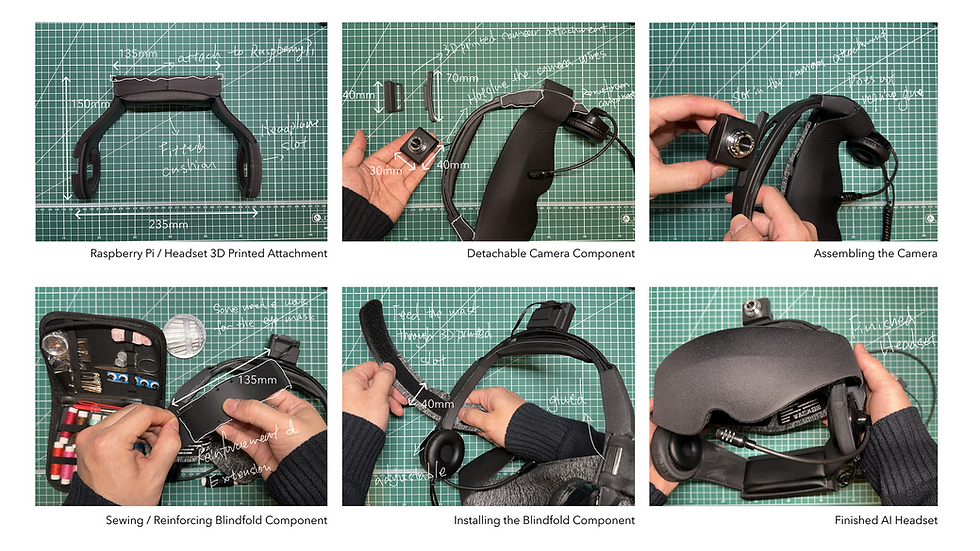 GPT驱动的AI头戴设备:我们设计的头戴设备是项目的关键组成部分,重点在于将各种现成组件进行符合人体工学的整合,以确保舒适性、功能性和安全性。头戴设备本身构成了基础结构,我们在此基础上安装了一个高质量的遮眼布,确保完全遮挡视觉,以准确模拟失明状态。一个摄像头组件用于捕捉实时视频流,这对于我们的AI处理视觉数据至关重要。