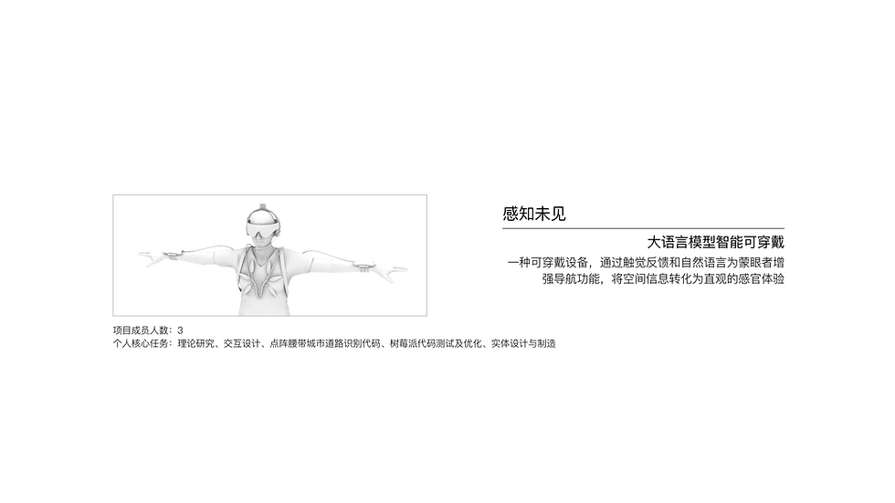 感知未见是一款实验性可穿戴设备,旨在探索通过替代感官输入进行导航的可能性。该设备结合触觉反馈与自然语言引导,帮助蒙眼个体间接理解空间信息。通过震动和语音提示,用户无需视觉输入即可在环境中导航,从而增强空间感知能力。本项目探讨了非视觉反馈如何改变感知方式,拓展了无障碍设计与大语言模型在导航与路径引导技术中的应用可能性。